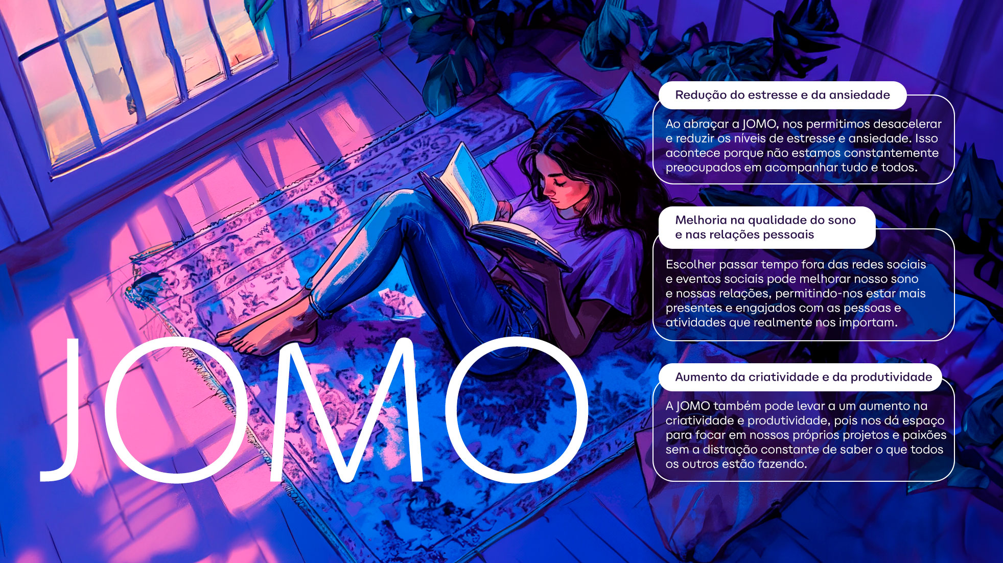 Ao invés de se sentir sobrecarregado pela pressão de estar sempre conectado e participando, a JOMO nos convida a apreciar os momentos de tranquilidade e as escolhas que fazemos em favor de nosso próprio tempo e espaço.