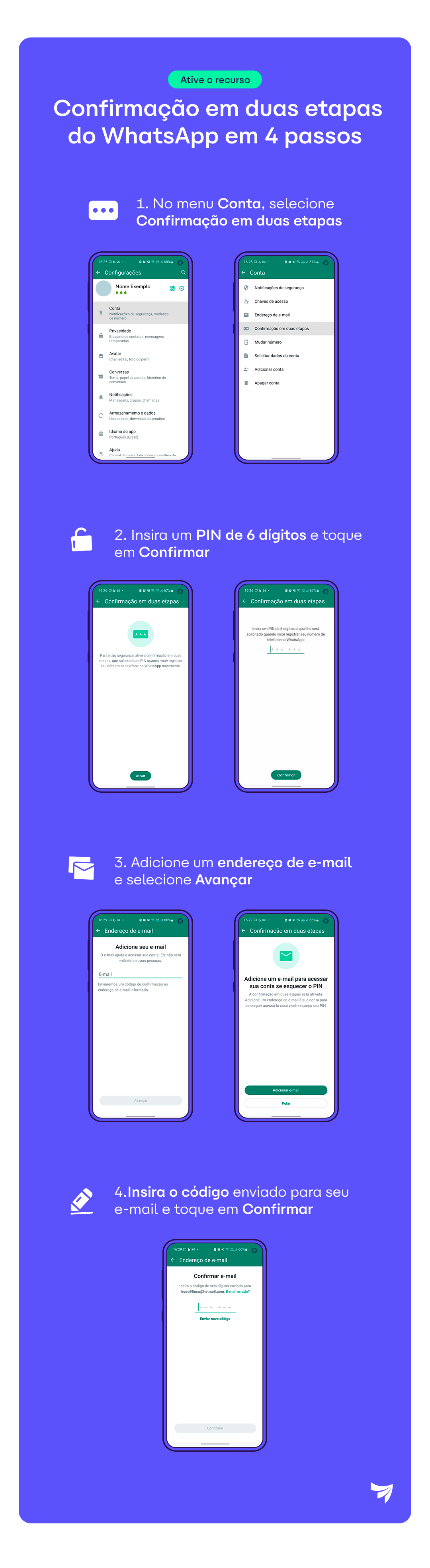 - Abra o WhatsApp, e no canto superior direito, onde aparecem os 3 pontos, selecione Configurações > Conta > Confirmação em duas etapas > Ativar;
